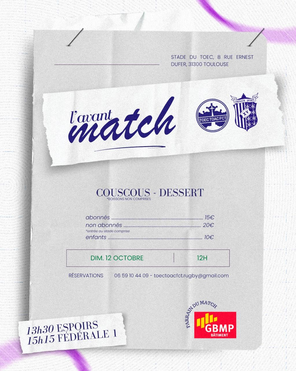 📅Rendez-vous dimanche 12 octobre au stade du TOEC pour la réception de Grenade.