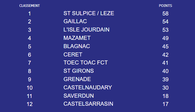 Une victoire qui compte double lors de ce déplacement à Grenade. Les deux clubs se tenaient à un seul petit point. Le gain du match permet à nos toulousains dans la course aux places qualificatives mais également d’augmenter le capital confiance avant la réception dimanche prochain du leader Saint-Sulpice-sur-Lèze.